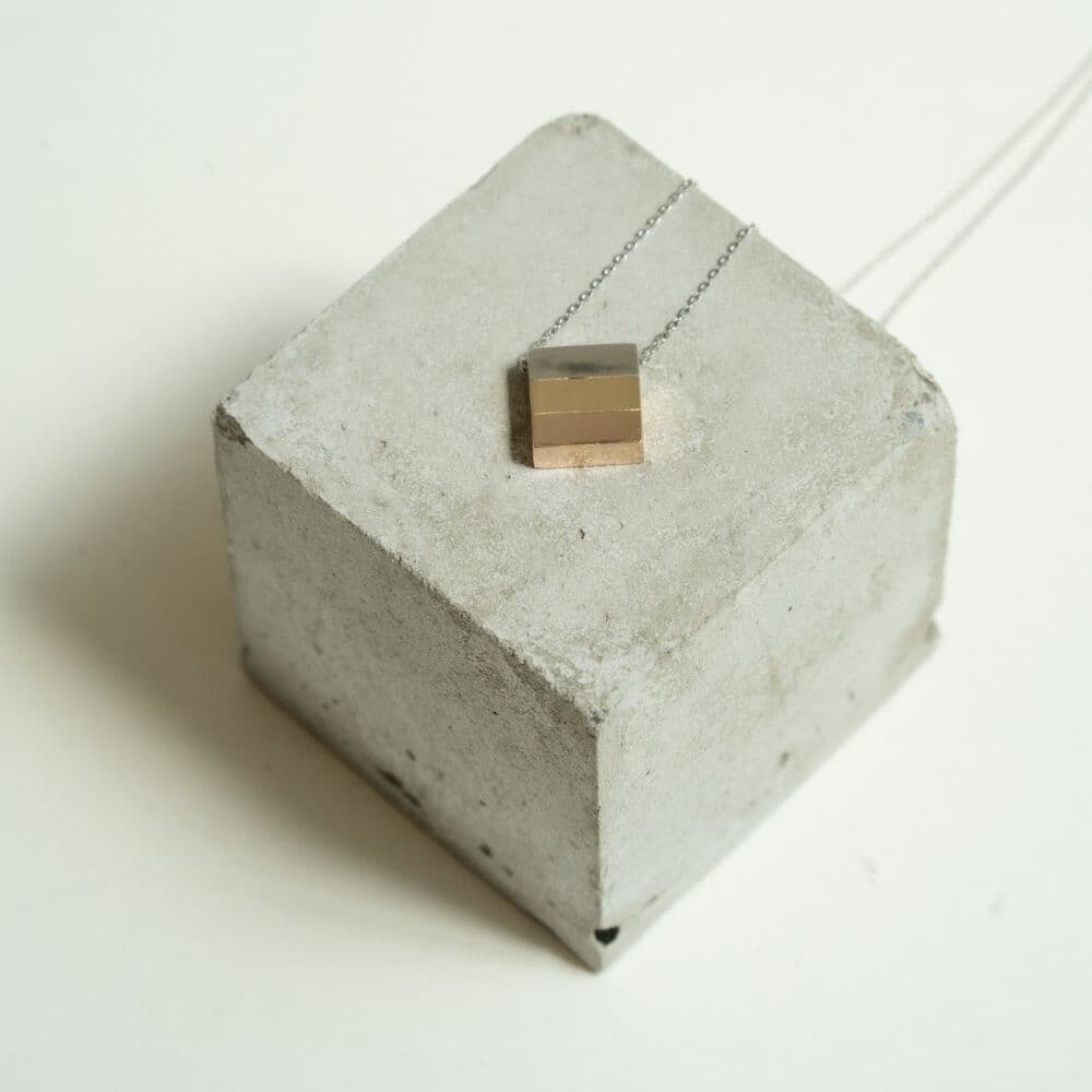 プラチナ、18金、18金ピンクゴールドを貼り合わせて作ったペンダント。3色の層で地金の美しさを贅沢に味わえるジュエリー。
